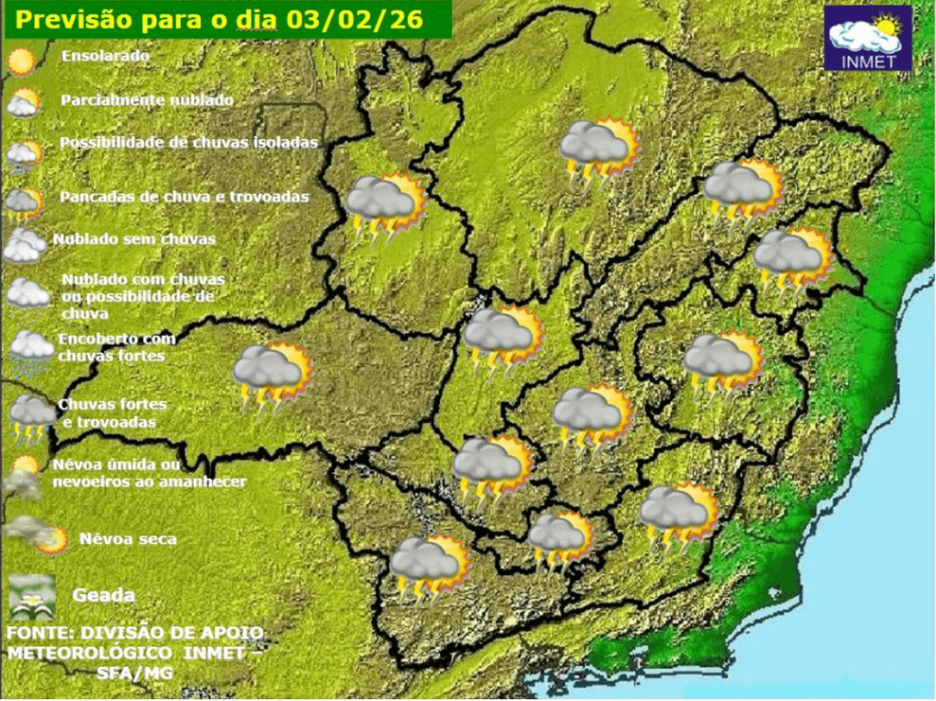 Aviso: As condições atmosféricas são favoráveis para ocorrência de chuvas intensas, de 30 a 60 mm/h ou até 100 mm/dia, com rajadas de ventos ocasionais, entre 60 e 100 km/h, em todas as regiões mineiras, pelo menos até o dia 04/02/2026.