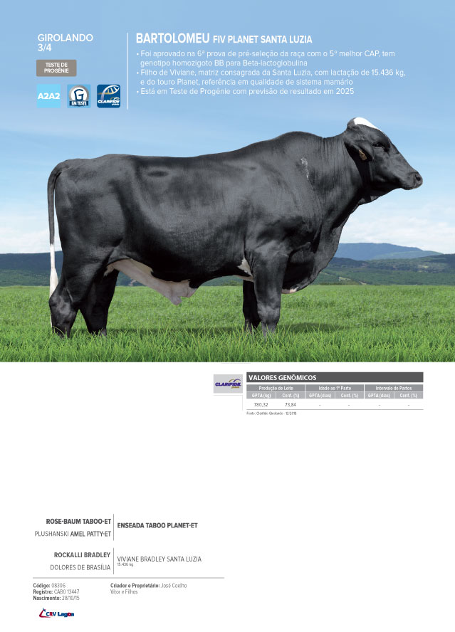 Foi aprovado na 6ª prova de pré-seleção da raça com o 5º melhor CAP, tem genótipo homozigoto BB para Beta-lactoglobulina