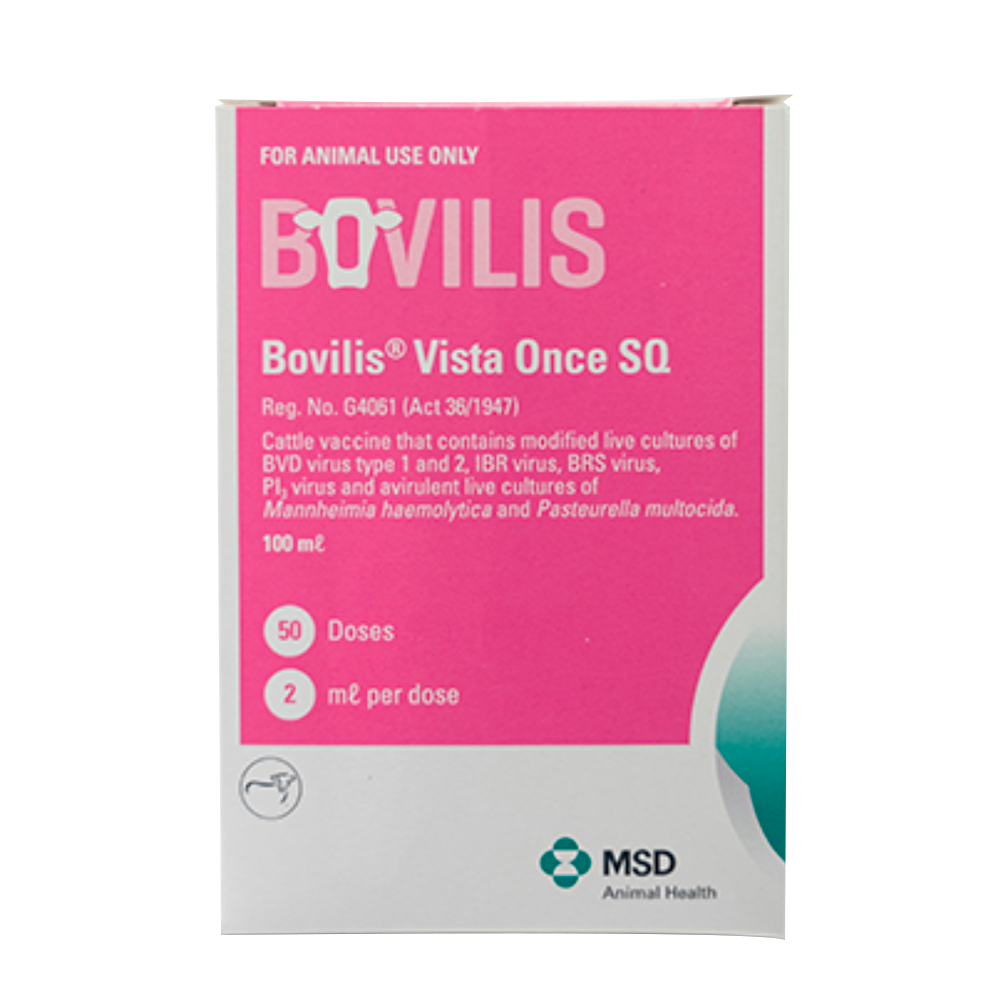 O produto é indicado para a vacinação de bovinos saudáveis, a partir de 3 meses de idade, como auxiliar na prevenção da doença respiratória causada pelo vírus respiratório sincicial bovino (BRSV) e vírus da Parainfluenza 3 (PI3) em bezerros e pelo vírus da rinotraqueíte infecciosa bovina (IBR) e vírus da diarreia bovina tipo 2 (BVDV2), e como auxiliar no controle da doença causada pelo vírus da diarreia bovina tipo 1 (BVDV1), por Mannheimia haemolytica e por Pasteurella multocida.A proteção foi demonstrada para Mannheimia haemolytica em animais vacinados a partir de 5 meses e para os demais antígenos da vacina em animais com 3 meses de idade. BOVILIS® VISTA® ONCE SQ também se destina a vacinação de vacas e novilhas saudáveis antes da reprodução como auxiliar na prevenção da infecção fetal, incluindo-se bezerros persistentemente infectados por BVDV (tipos 1 e 2); e como auxiliar na redução do aborto devido à IBR.