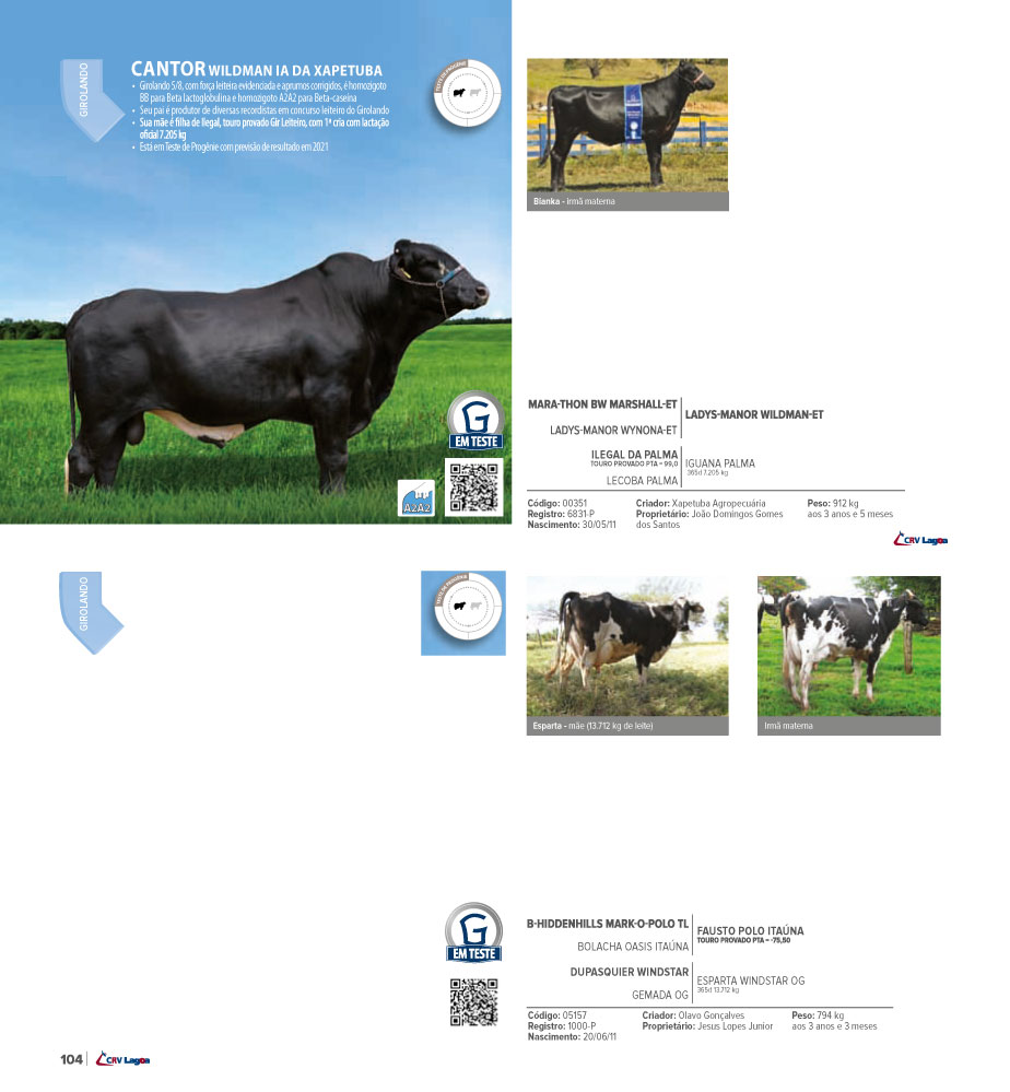 • Girolando 5/8, com força leiteira evidenciada e aprumos corrigidos, é homozigoto BB para Beta lactoglobulina e homozigoto A2A2 para Beta-caseína;
