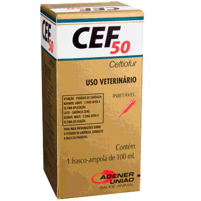 Cef-50 é uma suspensão pronta para uso à base de ceftiofur, uma cefalosporina semissintética de terceira geração. Seu mecanismo de ação é semelhante ao de outros antibióticos beta-lactâmicos, ou seja, inibe a síntese da parede celular bacteriana. O ceftiofur é resistente às enzimas beta-lactamases que inativam certos antimicrobianos como as penicilinas. Por isso, seu espectro de atividade é amplo, comparável ao da penicilina G, acrescentando-se maior atividade em relação às bactérias gram-negativas. Além disso, o ceftiofur atinge concentrações plasmáticas terapêuticas 1 a 5 horas após a administração parenteral, que se mantêm superiores à concentração necessária para matar os microrganismos por períodos de até 48 horas. Cef-50 é indicado para o tratamento de infecções gastrointestinais (diarreias), infecções respiratórias (pneumonias), infecções genitourinárias (metrites, cistites), pododermatites e meningoencefalite bacteriana. Quando utilizado conforme as recomendações de uso, os resíduos de ceftiofur no leite são muito baixos, não sendo necessário o descarte do leite dos animais tratados.