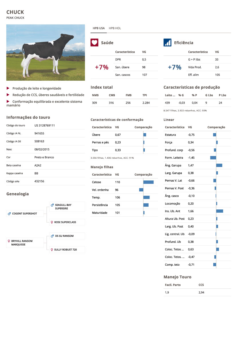 Indicado para pastejo, novilhas, sólidos (BB e A2A2) e fertilidade de sêmen (BullsEye);