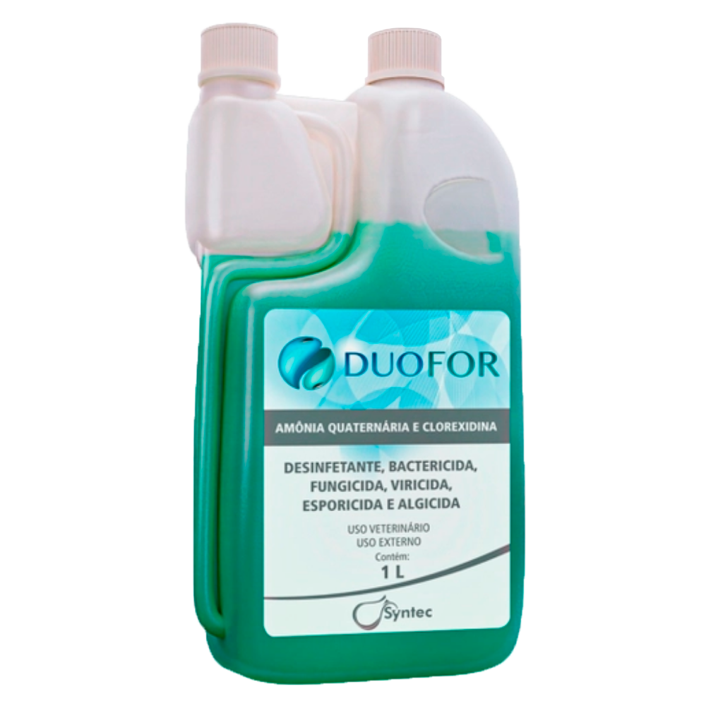 Duofor® é um sanitizante de amplo espectro de ação, ideal para a limpeza e desinfecção de instalações, instrumentais cirúrgicos, maquinários e veículos de transporte de animais do segmento pecuário. A ação sinérgica do Cloreto de Cetrimônio a 25% com o Digluconato de Clorexidina a 20%, conferem ao Duofor® elevado poder de eliminação contra bactérias e suas formas esporuladas, fungos, vírus e algas. Duofor® é inodoro, não corrosivo e não é inativado por resíduos orgânicos.