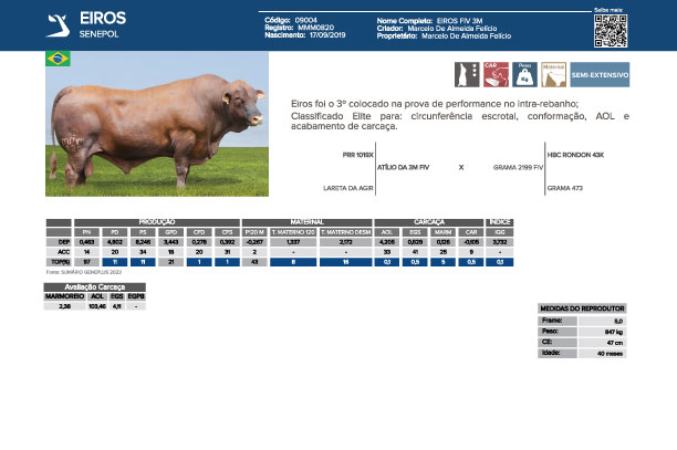 Na avaliação da Embrapa/Geneplus é Elite para características maternais, circunferência escrotal, conformação, AOL, acabamento de carcaça e para todas as características de carcaça e CAR (eficiência alimentar)