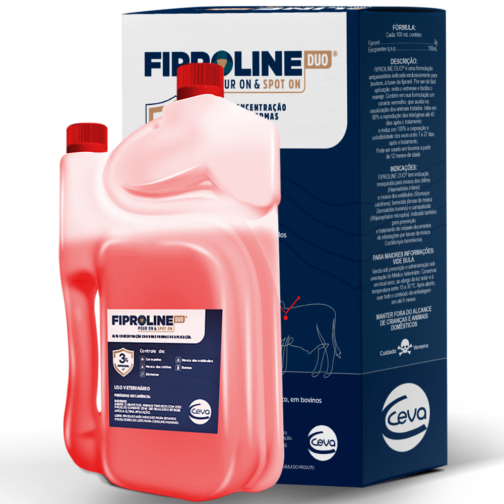 Fiproline Duo® é uma solução tópica, de aplicação pour-on e spot-on, que contém fipronil (3%) para controle de ectoparasitas em bovinos.