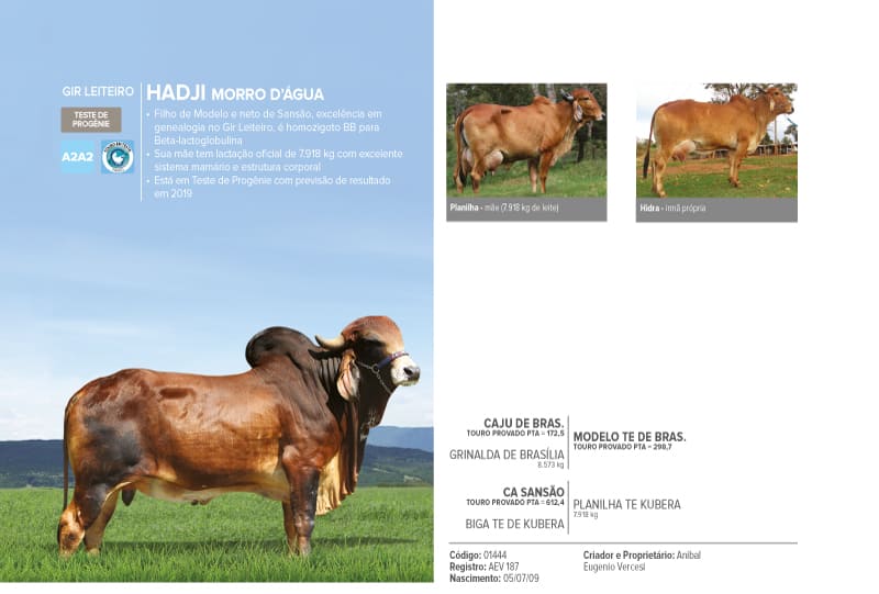 Filho de Modelo e neto de Sansão, excelência em genealogia no Gir Leiteiro, é homozigoto BB para Beta-lactoglobulina