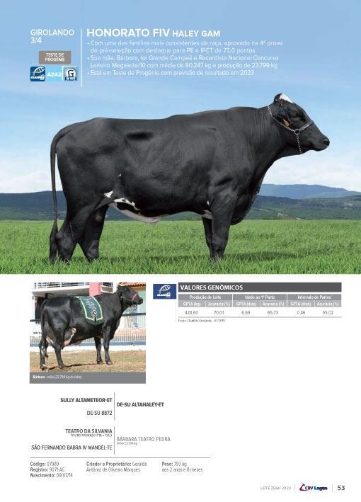 Sua mãe, Bárbara, foi Grande Campeã e Recordista Nacional Concurso Leiteiro Megaleite/10 com média de 80,247 kg e produção de 23.799 kg