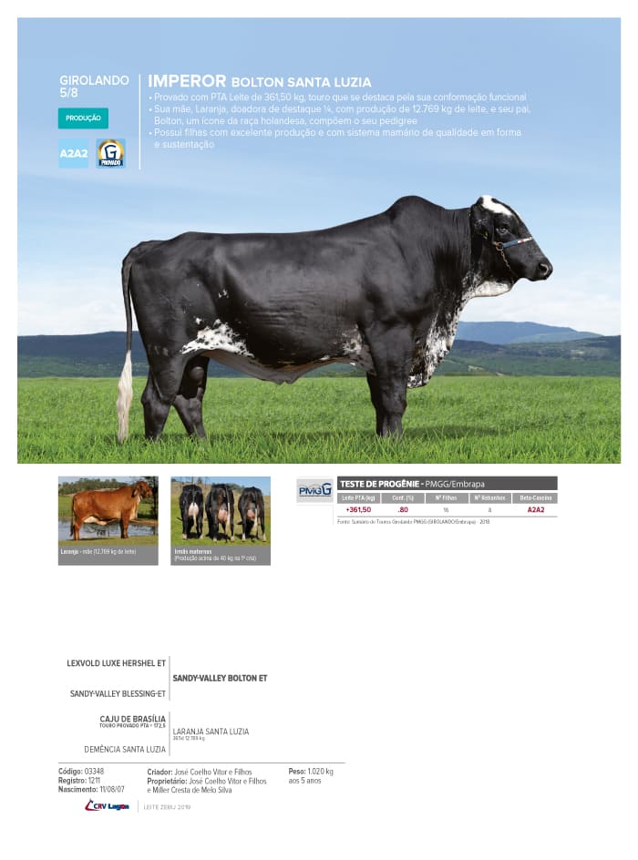• Sua mãe, Laranja, doadora de destaque ¼, com produção de 12.769 kg de leite, e seu pai, Bolton, um ícone da raça holandesa, compõem o seu pedigree