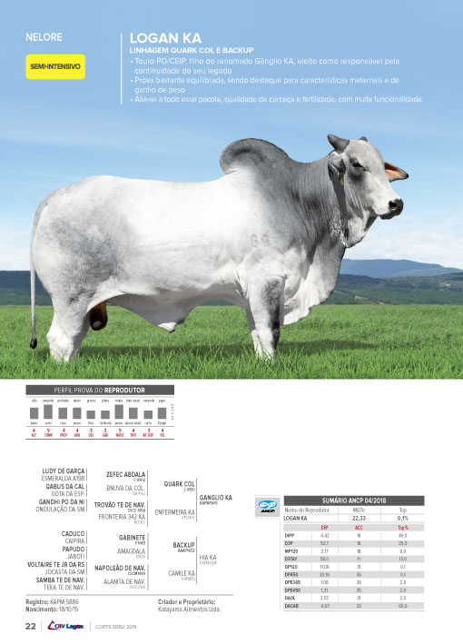 » Sem dúvida um dos melhores filhos do grande GANGLIO KA, em vaca BACKUP. Pedigree moderno e aberto para as principais linhagens do Nelore;
