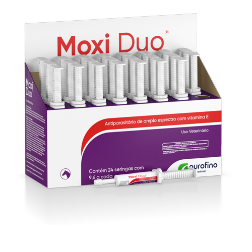 Moxi Duo deve ser administrado por via oral, exclusivamente para equinos, aplicada sobre a língua do animal, no fundo da boca, que deve estar sem alimento, na dosagem de 1,6 g para cada 100 kg de peso, obedecendo à graduação que consta no êmbolo da seringa, sendo que a seringa completa é suficiente para tratar 600 kg de peso corporal. Após a aplicação, manter a cabeça do animal levantada por alguns segundos.