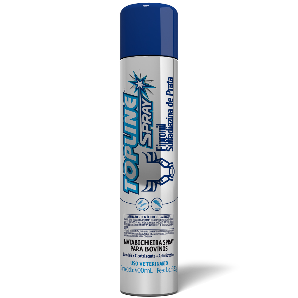 Descrição: Topline® Spray é administrado por via tópica sendo eficaz na prevenção e tratamento de bicheira (miíase não furuncular) causada por larvas da mosca Cochliomyia hominivorax e no tratamento de berne (miíase furuncular) causada por larvas da mosca Dermatobia hominis.